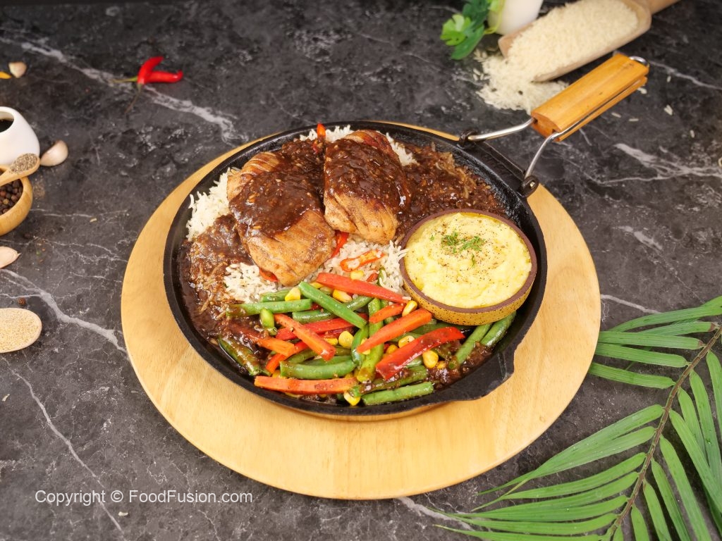 -Add garlic fried rice,stir fried vegetables,creamy mashed potato,chicken fillets,garlic & pepper sauce & serve!