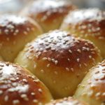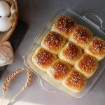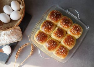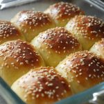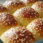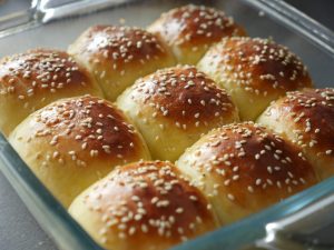 Buns ka upper whisked anda laga ker safed til sprinkle ker lein.