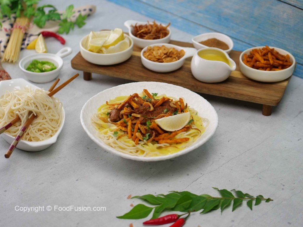 -In a serving plate,add spaghetti,prepared curry,beef currry,chips,fried garlic,fried onion,fresh coriander, lemon juice,chaat masala,lemon & serve!