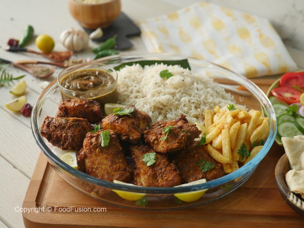 Serve fried fish with zeera rice,potato fries/chips,onion rings and prepared tamarind mint sauce.