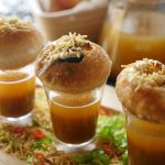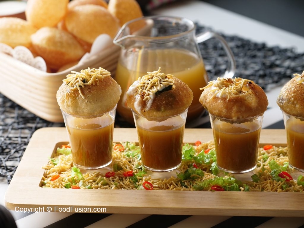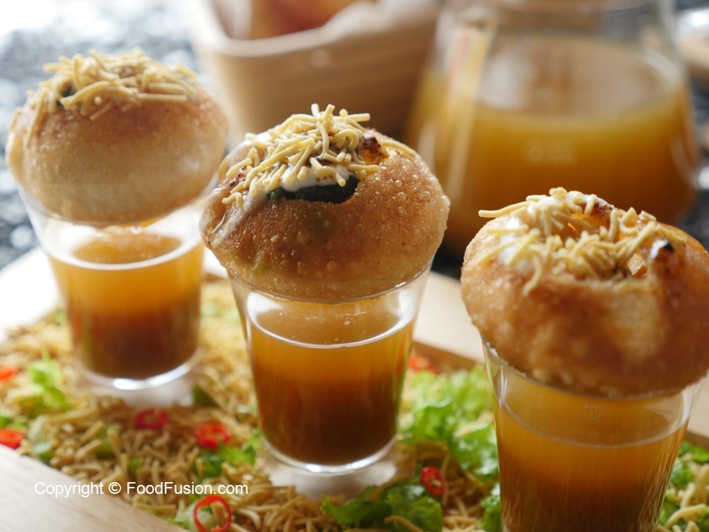 Poke gol gappa from the center,add chickpeas,potato & whole green gram,spicy green chutney,yogurt, prepared meethi chutney,sprinkle chaat masala,nimco sev & serve with prepared minty khatta pani!