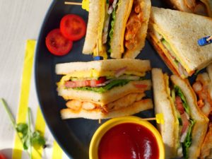 -On three bread slices,add prepared sauce,tandoori chicken pieces,cheese slice,flip one bread slice,add prepared sauce,salad leaves,onion,tomato,cucumber,cooked egg & flip bread slice to make a sandwich (makes 5).
