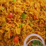 -Tawa veg pulao ko onion rings sa garnish ker lein aur zucchini dahi ka saath serve karein.