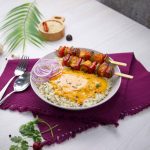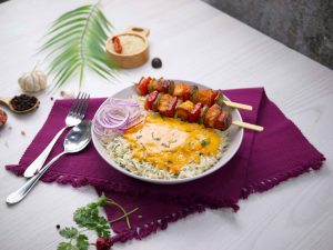 -In a serving bowl,add prepared rice,chicken tikka sticks,prepared creamy BBQ sauce,onion rings,fresh coriander & serve!