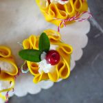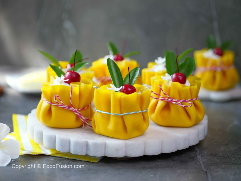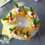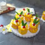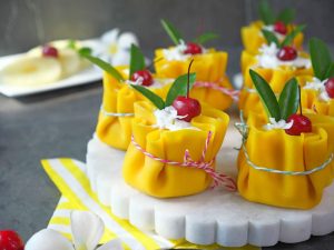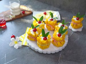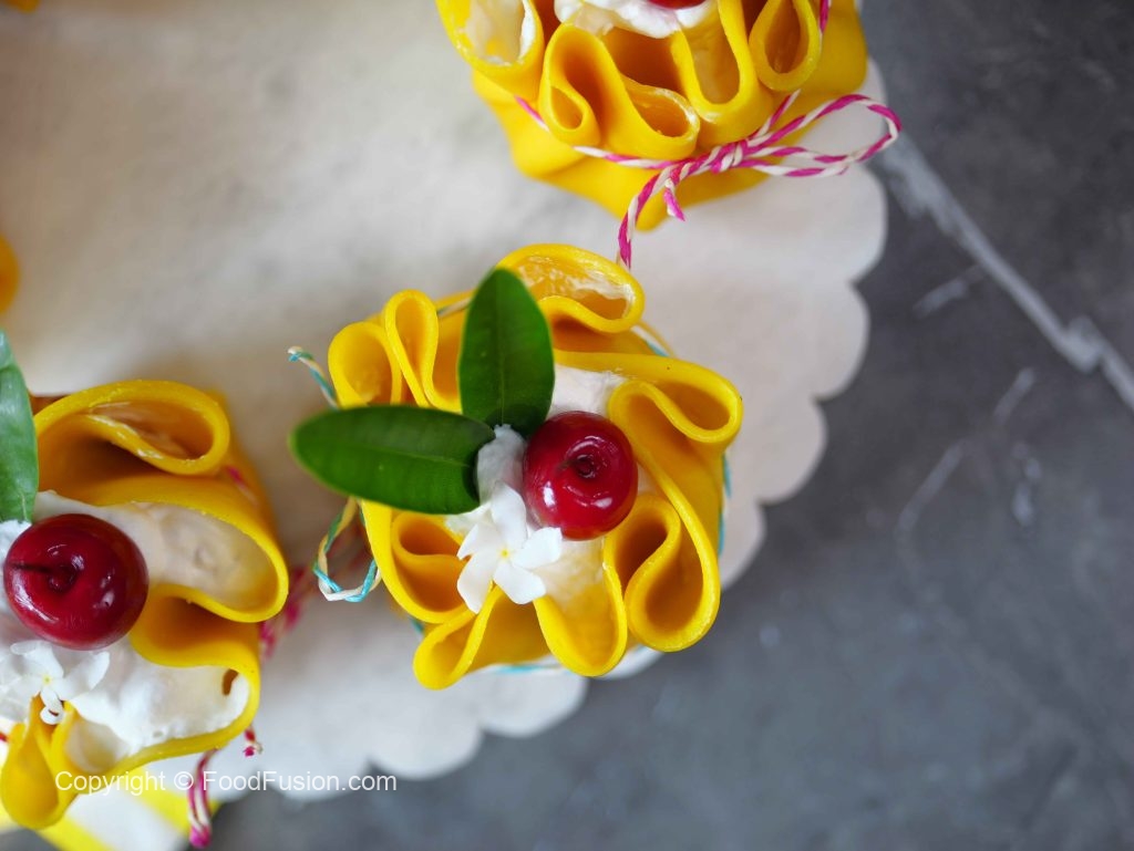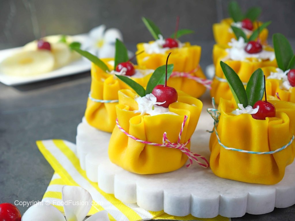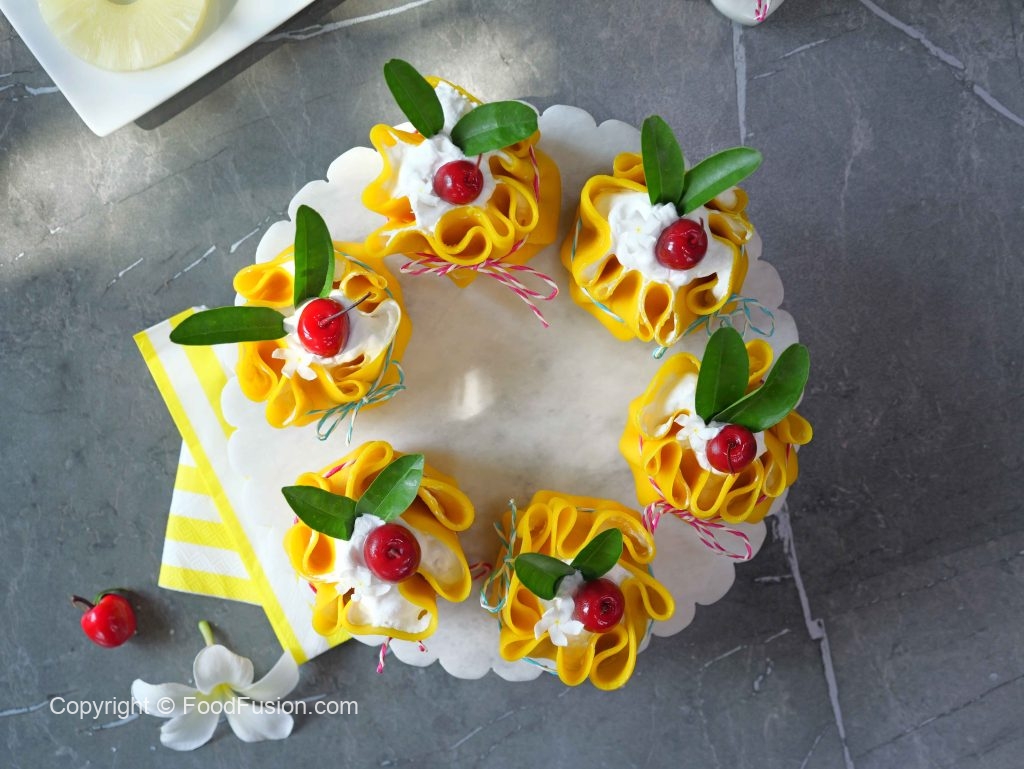 -Trim uneven edges of crepes with the help of 7 inches round cutter, pipe out prepared cream cheese frosting,place sponge cake,add cream cheese frosting,pineapple chunks,cream cheese frosting,gather all the sides & tie with rope.